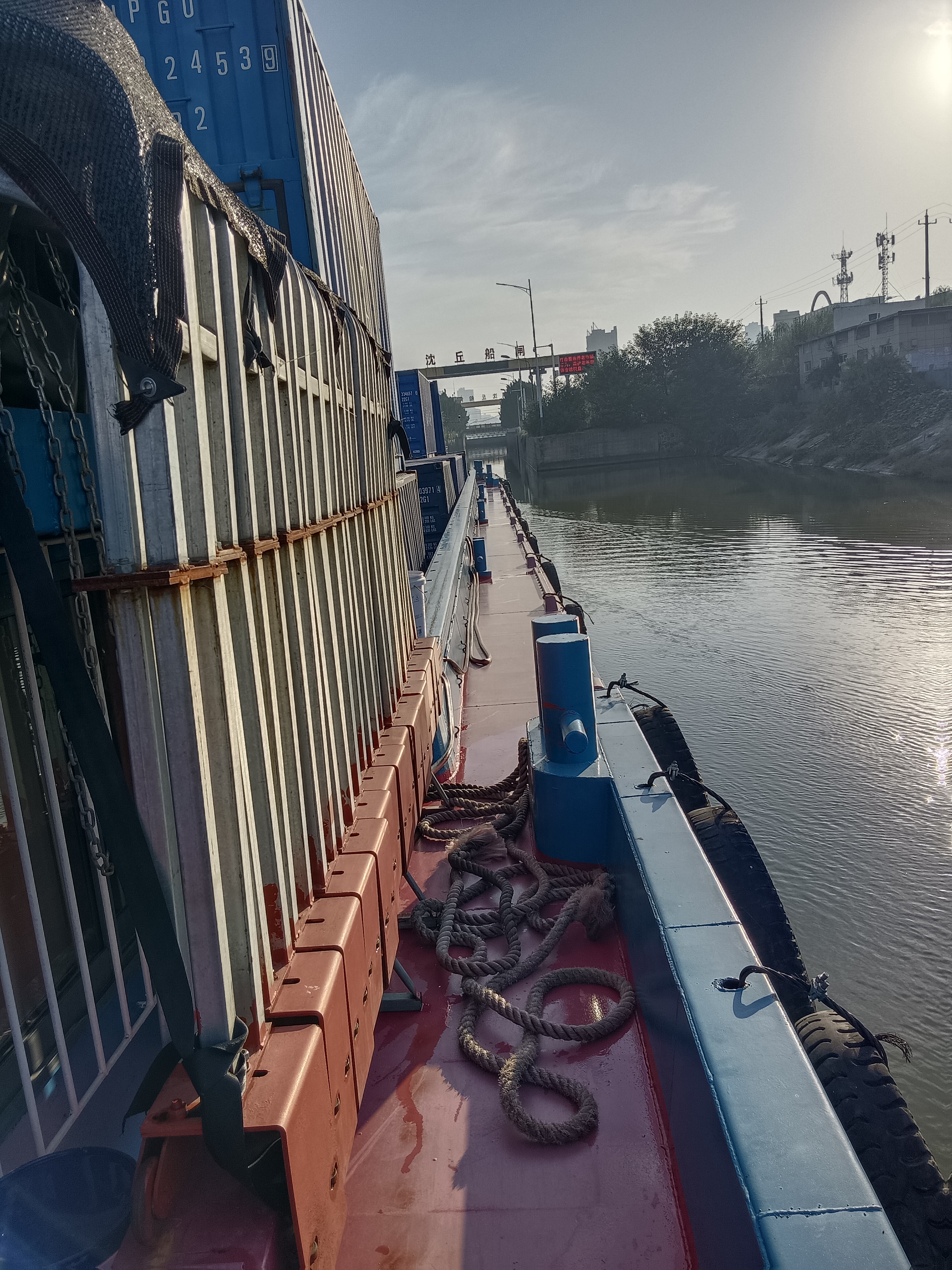• 9月25日傍晚,船老大董海軍吊裝好了36個(gè)集裝箱,從項(xiàng)城港啟航了。他運(yùn)送的貨物是純堿,生產(chǎn)玻璃的原材料,目的地是安徽鳳陽(yáng)港。這次,記者一行從水路出發(fā),隨行采訪。