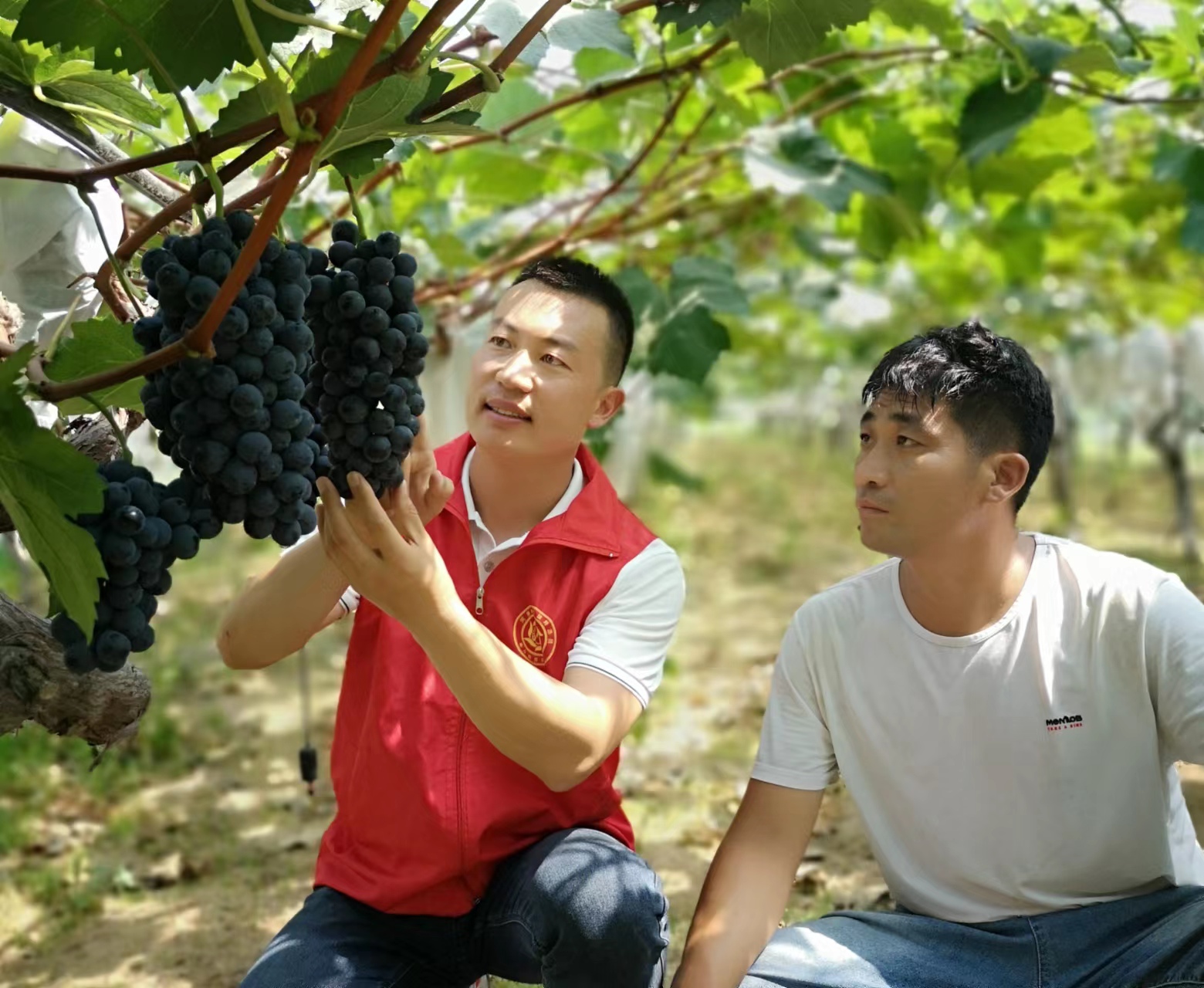 (左一:“河南省最美村官”張耀和村民一起查看葡萄長勢)