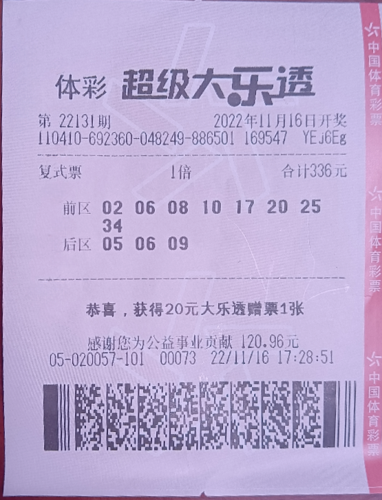 11月16日,體彩大樂透第22131期開獎,開獎號碼為:前區(qū)02、06、08、10、17,后區(qū)05、06。本期通過2.80億元銷量,為國家籌集彩票公益金1.01億元。本期全國開出13基本投注一等獎,單注獎金723萬元,分落河南(3注)、浙江(2注)、福建(2注)、云南(2注)、河北、黑龍江、山東、湖北。第22131期開獎后,獎池滾存10.23億元。