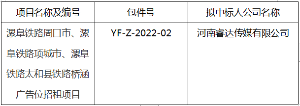 漯阜鐵路周口市、漯阜鐵路項(xiàng)城市、漯阜鐵路太和縣鐵路橋涵廣告位招租項(xiàng)目評標(biāo)結(jié)果公示