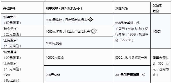 活動期間,購彩者在我省任一體彩銷售實體店購買指定活動票種,若單張彩票刮中符合獎勵條件的獎級(或獎級及標志),經(jīng)實體店終端兌獎設備(IVT或BCR)成功完成獎金兌付及促銷兌獎掃描后,另可獲贈相應的獎品。獎品數(shù)量有限,送完為止,詳見下表: