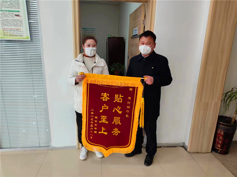 “項(xiàng)城蓮花大道支行的工作人員服務(wù)熱情,辦事靠譜,處處為我們著想,錢存在這里,我十分放心!”2月12日,項(xiàng)城市單女士為建行周口分行項(xiàng)城蓮花大道支行送來一面寫有“客戶至上 貼心服務(wù)”的錦旗, 對蓮花大道支行全體工作人員的熱情高效、認(rèn)真負(fù)責(zé)的工作態(tài)度表示認(rèn)可和感謝。單女士十分感激地把錦旗遞給了項(xiàng)城蓮花大道支行負(fù)責(zé)人胡洋洋,并為其點(diǎn)贊。