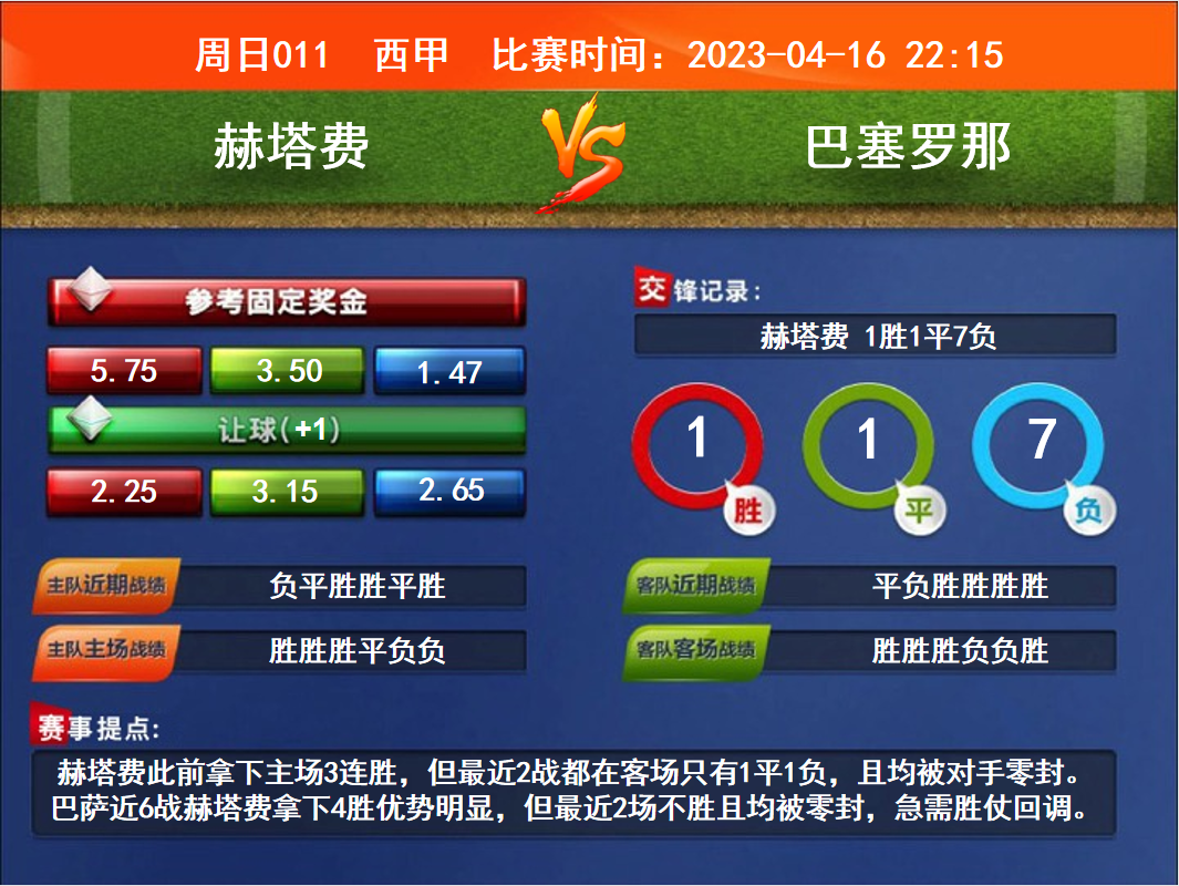 賽事提點(diǎn):赫塔費(fèi)此前拿下主場3連勝,但最近2戰(zhàn)都在客場只有1平1負(fù),且均被對手零封。巴薩近6戰(zhàn)赫塔費(fèi)拿下4勝優(yōu)勢明顯,但最近2場不勝且均被零封,急需勝仗回調(diào)。
