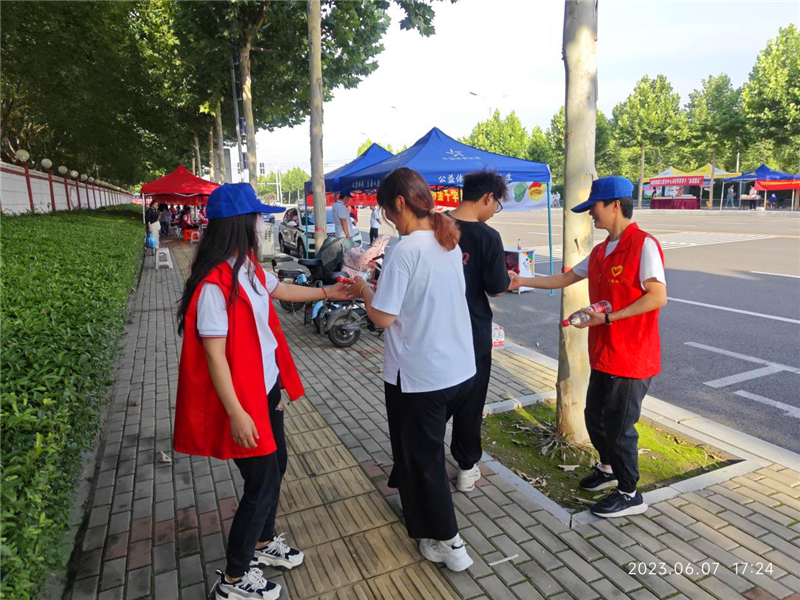 本次活動(dòng)周口體彩分中心協(xié)調(diào)到40余頂帳篷,在考場外設(shè)置服務(wù)點(diǎn)為考生及家長提供飲用水、歇息區(qū)。結(jié)合周口市文昌中學(xué)實(shí)際情況,在考場校園內(nèi)搭設(shè)一整片體彩遮陽帳篷陰涼區(qū)域,為考生候場提供一片“清涼”。 與此同時(shí),體彩志愿者熱情地為考生及家長提供愛心服務(wù),送上一瓶瓶清涼的礦泉水,帶著滿滿的愛心與祝福,給莘莘學(xué)子們加油助威,讓他們切身感受到體彩人的擔(dān)當(dāng)和真摯的關(guān)愛。