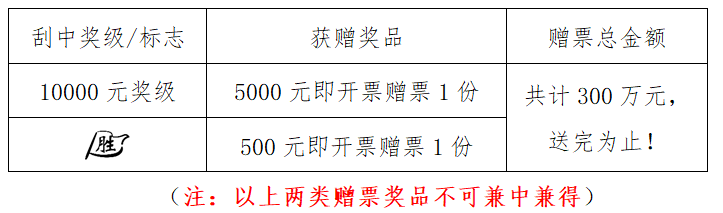 活動(dòng)期間,購彩者在河南省范圍內(nèi)任一體彩銷售實(shí)體店購買指定活動(dòng)票種,若單張彩票刮中符合獎(jiǎng)勵(lì)條件的獎(jiǎng)級(jí)或標(biāo)志,經(jīng)實(shí)體店終端兌獎(jiǎng)設(shè)備成功完成獎(jiǎng)金兌付及促銷兌獎(jiǎng)掃描后,即可獲得即開票贈(zèng)票獎(jiǎng)品一份。總額有限,送完為止,詳見下表: