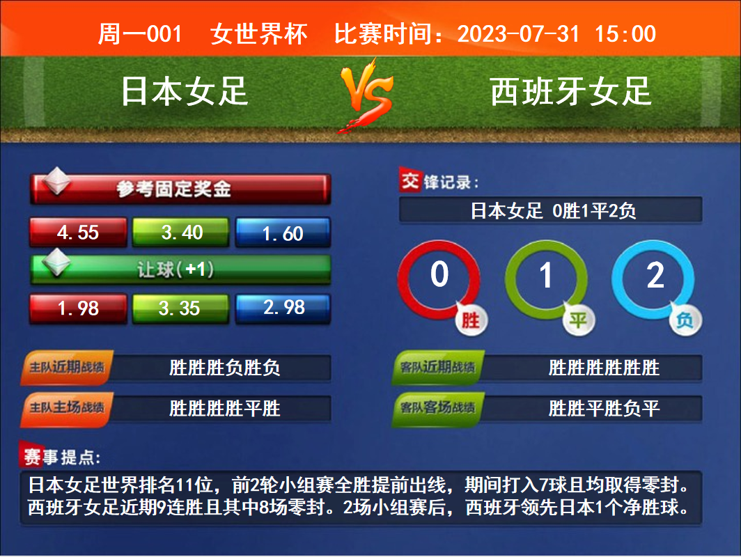 比賽時間:2023-07-31 15:00賽事提點:日本女足世界排名11位,前2輪小組賽全勝提前出線,期間打入7球且均取得零封。西班牙女足近期9連勝且其中8場零封。2場小組賽后,西班牙領(lǐng)先日本1個凈勝球。