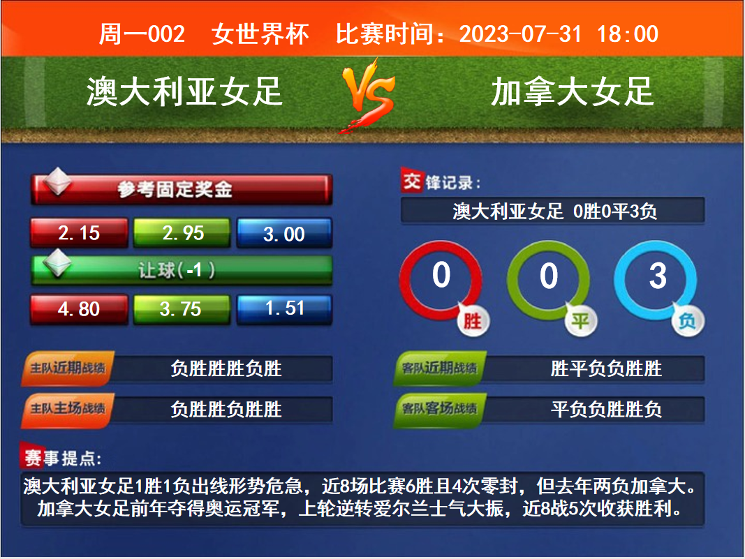 比賽時間:2023-07-31 18:00賽事提點:澳大利亞女足1勝1負(fù)出線形勢危急,近8場比賽6勝且4次零封,但去年兩負(fù)加拿大。加拿大女足前年奪得奧運冠軍,上輪逆轉(zhuǎn)愛爾蘭士氣大振,近8戰(zhàn)5次收獲勝利。