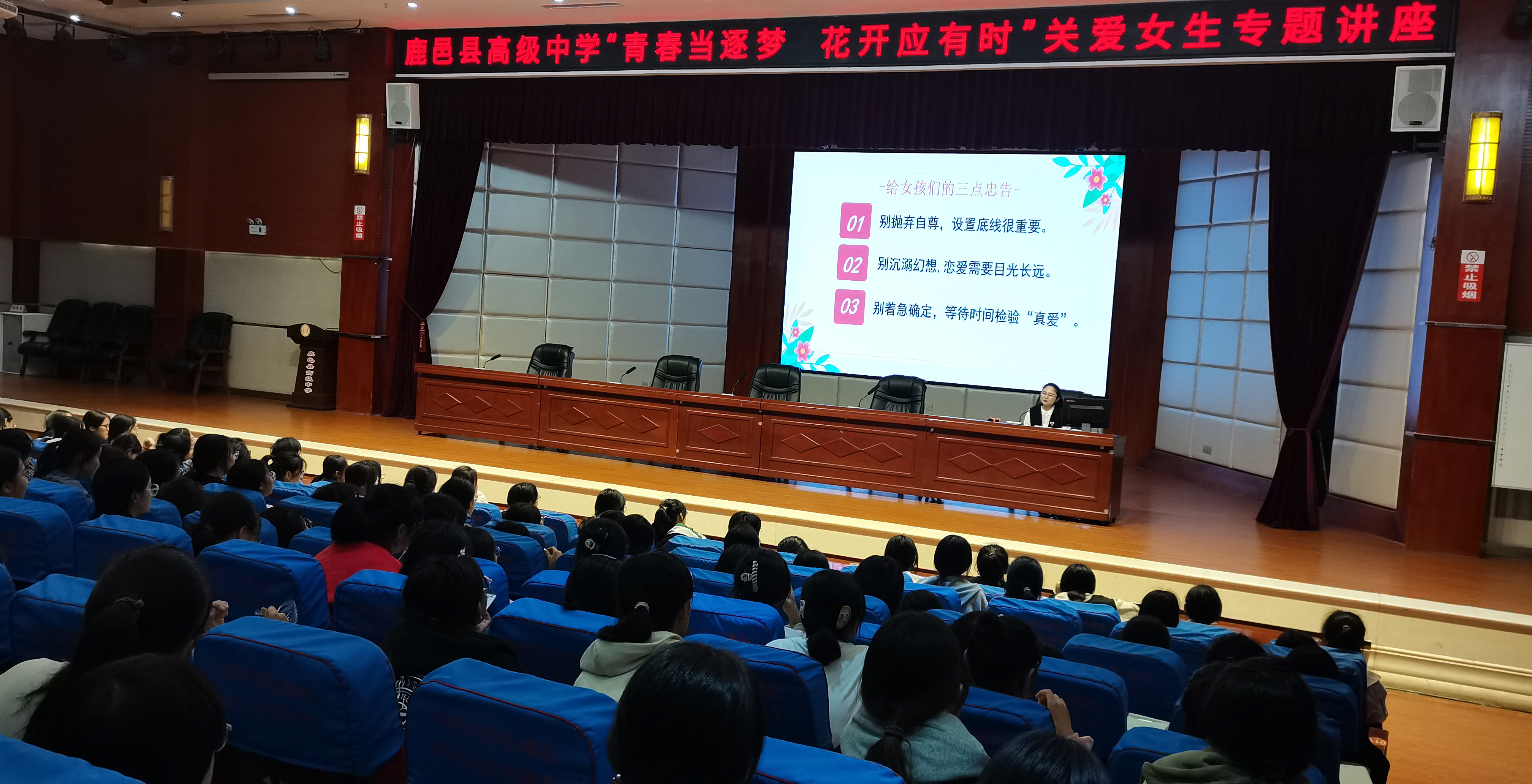 9月26日、27日晚,鹿邑縣高級中學(xué)舉行兩場以“青春當(dāng)逐夢,花開應(yīng)有時(shí)”為主題的關(guān)愛女生專題講座。講座進(jìn)一步推動(dòng)學(xué)校心理健康教育工作,幫助學(xué)生提高心理健康水平,引導(dǎo)女生正確認(rèn)識(shí)青春期心理及生理上的變化,樹立積極向上的人生觀。此次專題講座由學(xué)校婦委會(huì)主任夏寧主持。