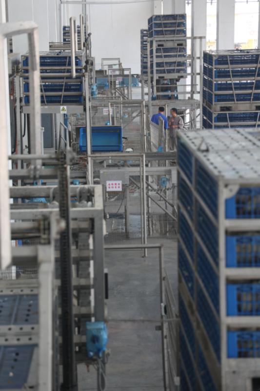 宰雞第一步先消毒,一筐筐自動(dòng)分好的白羽活雞上架后即得到?jīng)_洗,“干干凈凈”地進(jìn)入下一程序——掛雞。步驟與步驟銜接中的自動(dòng)化程度很高,掛雞室光線略暗。“我們采用國(guó)際化標(biāo)準(zhǔn),宰殺環(huán)節(jié)在暗室進(jìn)行?!毕嚓P(guān)人員說。