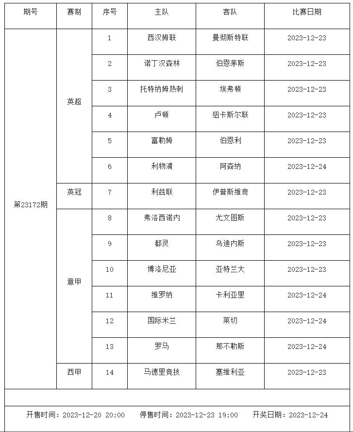 足球彩票勝負(fù)游戲(14場和任選9場)第23172期賽程: