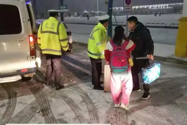 當男子的女兒順利到達高鐵站后,交警們又將他送回原地??吹骄仍藛T已經到達,交警們再次投入到雪夜的巡邏中。他們的熒光黃制服與白雪交相輝映,成為雪夜里最溫暖的色彩。②2