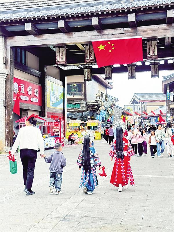 10月7日,游客身著傳統(tǒng)民族服飾,漫步在周口建業(yè)運(yùn)河古鎮(zhèn)。她們一襲華裳,略施粉黛,與古色古香的建筑融為一體,讓人仿佛置身于一場時空穿越之旅,營造了喜慶的節(jié)日氛圍。
