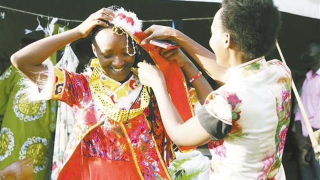 11月10日,學(xué)生在盧旺達卡永扎試穿中國服飾?!?a href="http://m.chebaowu.com/content/2021-11/13/content_959142.html" target="_blank" >[詳細]