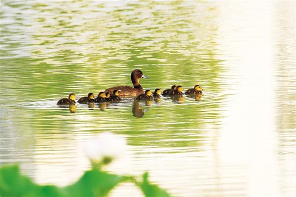 6月24日,世界極度瀕危物種、國(guó)家一級(jí)保護(hù)野生動(dòng)物青頭潛鴨現(xiàn)身淮陽(yáng)龍湖。當(dāng)日,一只青頭潛鴨帶著10只可愛的“鴨寶寶”在湖中緩緩游弋。有關(guān)方面人士告訴記者,種種跡象可以證明:青頭潛鴨已在淮陽(yáng)龍湖國(guó)家濕地公園安家落戶、繁衍生息。