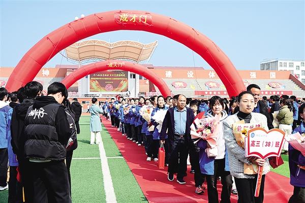 2月27日上午,淮陽中學運動場上洋溢著青春的氣息,一支支朝氣蓬勃的隊伍走過成人門。