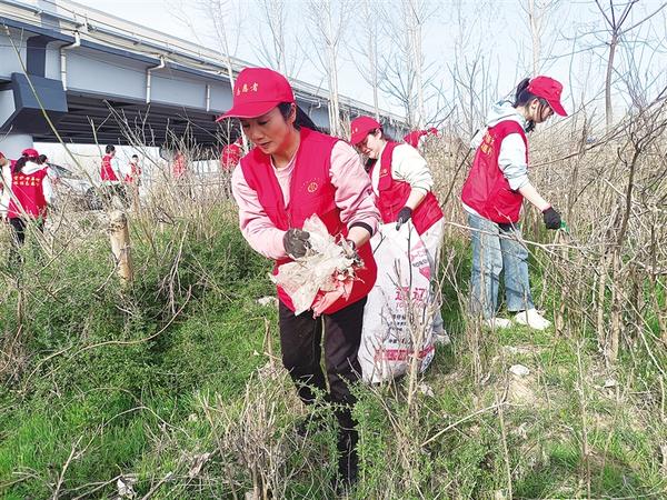 3月22日,志愿者在沙潁河畔撿拾垃圾。當(dāng)日,67名來自周口市環(huán)境保護(hù)協(xié)會、周口師范學(xué)院、周口恒大中學(xué)的環(huán)保志愿者,在中心城區(qū)沙潁河畔開展“世界水日、中國水周,護(hù)河凈灘在行動”活動,以實(shí)際行動踐行“綠水青山就是金山銀山”理念。