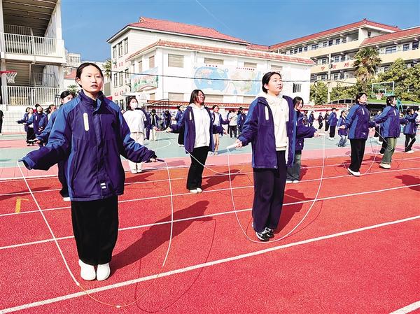 2月26日,周口市第十九初級(jí)中學(xué)九年級(jí)學(xué)生在大課間跳繩。從2025年春季學(xué)期起,我市全面推動(dòng)義務(wù)教育階段學(xué)校每天開展兩小時(shí)綜合體育活動(dòng)。