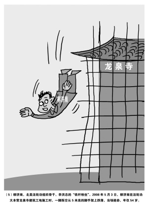 ?、?nbsp;柳濟(jì)南,北美法輪功組織骨干,李洪志的鐵桿粉絲。2008年5月3日,柳濟(jì)南在法輪功大本營(yíng)龍泉寺建筑工地施工時(shí),一腳踏空從5米高的腳手架上跌落,當(dāng)場(chǎng)斃命,年僅54歲。(漫畫作者 星雨)