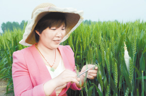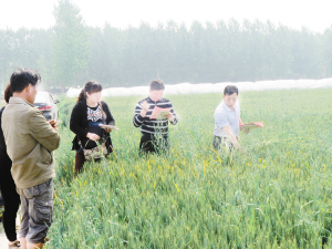 下圖:昨日,項(xiàng)城市農(nóng)科所技術(shù)人員正在進(jìn)行小麥雜交授粉。連日來(lái),該所抓住小麥?zhǔn)诜燮诘那绾锰鞖?,組織技術(shù)人員開(kāi)展雜交授粉實(shí)驗(yàn),確保小麥單產(chǎn)同步提高。(蔣樹(shù)保 攝)