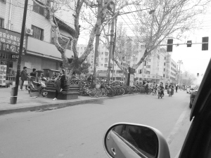 圖② 五一路與交通大道口東北角人行道成了“存車場(chǎng)”,行人只能繞行快車道。