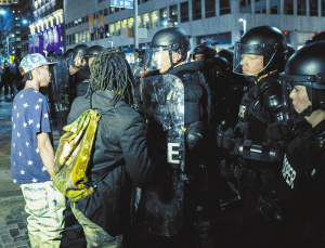 5月23日,在美國俄亥俄州克利夫蘭,兩名抗議者與警察對(duì)峙。美國俄亥俄州克利夫蘭市一名在2012年參與槍擊致死兩名未持武器的黑人而遭到刑事起訴的白人警察,23日被判無罪。此后,當(dāng)?shù)爻霈F(xiàn)抗議。