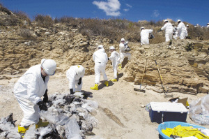 5月22日,在美國加利福尼亞州圣巴巴拉海岸邊,一隊(duì)清理人員將收集的袋裝油污傳送運(yùn)離。美國加州圣巴巴拉縣的海岸線附近19日發(fā)生嚴(yán)重管道漏油事件,泄漏的原油在雷福吉?dú)W州立海灘附近海域形成浮油帶。