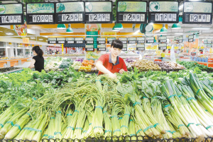 6月9日,一名工作人員正在市區(qū)一超市內(nèi)擺放蔬菜。當(dāng)日,國家統(tǒng)計(jì)局發(fā)布的數(shù)據(jù)顯示,2015年5月,全國居民消費(fèi)價(jià)格總水平同比上漲1.2%。(牟宇 攝)