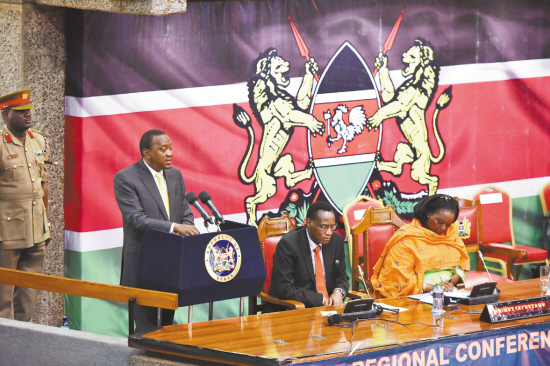 肯尼亞舉辦地區(qū)會議呼吁國際社會合作反恐 6月27日,在肯尼亞內羅畢,肯尼亞總統(tǒng)肯雅塔(左)在地區(qū)會議上致閉幕辭??夏醽喺?5日至27日在首都內羅畢舉辦地區(qū)會議,探討如何應對暴力極端主義和恐怖活動,并呼吁國際社會合作反恐。(本欄文圖均據(jù)新華社發(fā))
