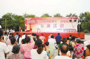 7月13日,沈丘縣“百姓宣講直通車”進(jìn)基層宣講首場(chǎng)演出在該縣中華槐園千字文廣場(chǎng)舉行,舞蹈、戲曲、小品、大鼓書等多樣化的藝術(shù)形式,為前來游玩休閑的市民獻(xiàn)上了一道豐厚的精神大餐,讓大家在娛樂之余,對(duì)黨的新理論新政策有了更多的了解。圖為節(jié)目演出現(xiàn)場(chǎng)。(邵永成 攝)